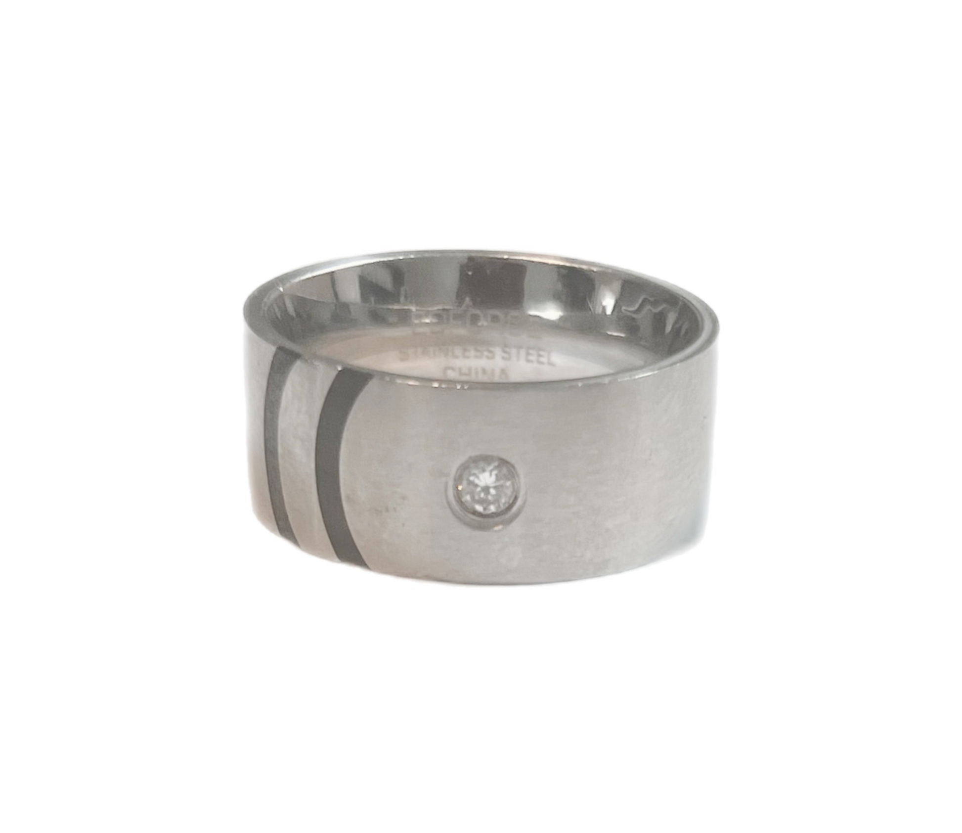 Anel Tipo Aliança em Aço Inoxidável com 2 Arcos Pretos e Zircónias no Centro.