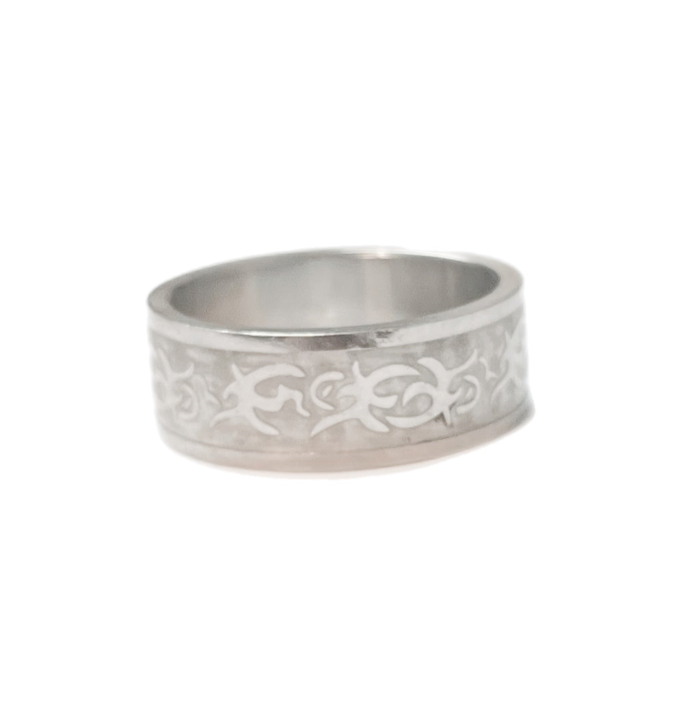 Anel Tipo Aliança Larga para Homem em Aço Inoxidável com Padrão Letras Chinesas.