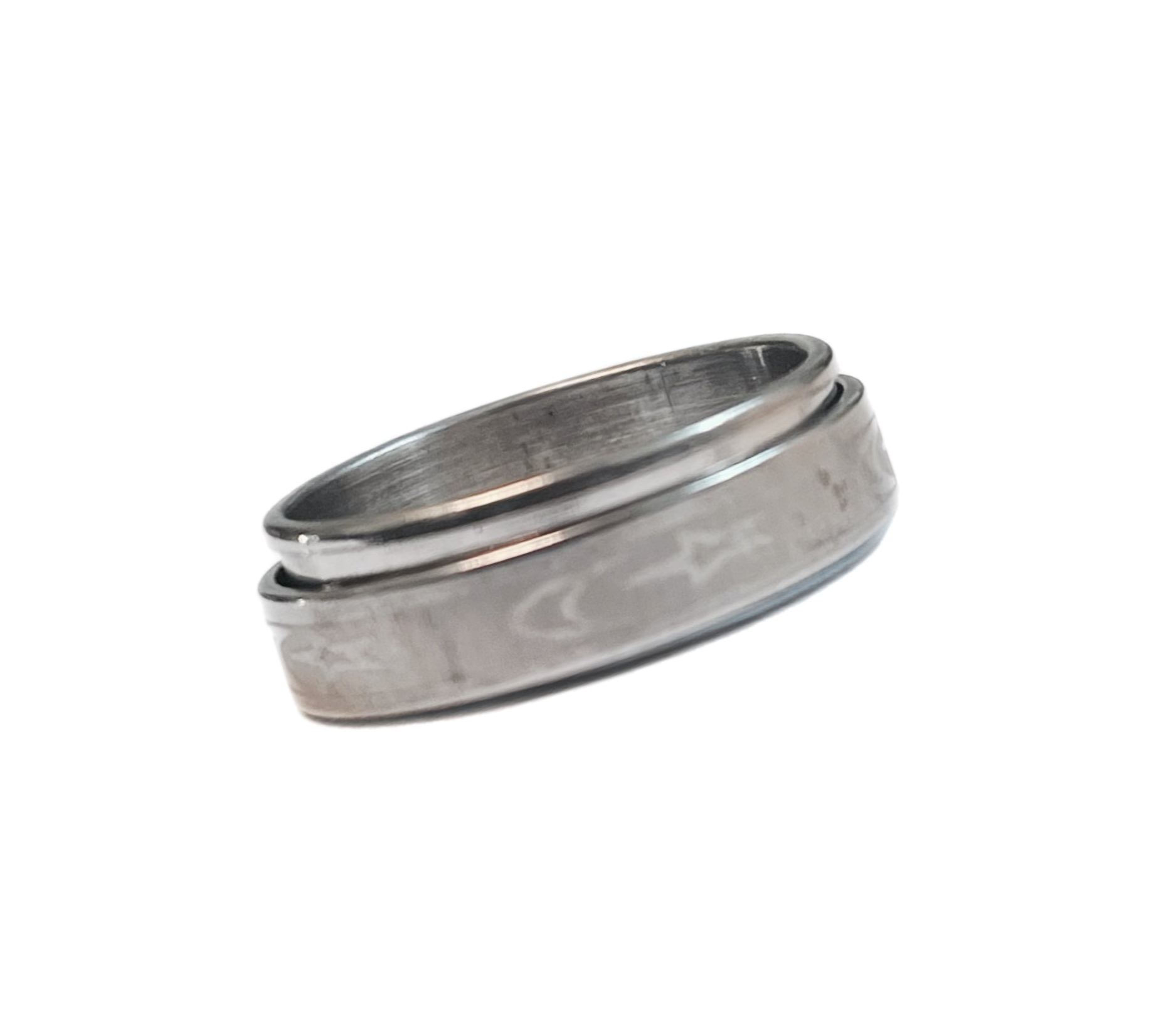 Anel Giratório Anti-Stress em Aço Inoxidável com Desenho Estrela e Lua, Cor Prata.