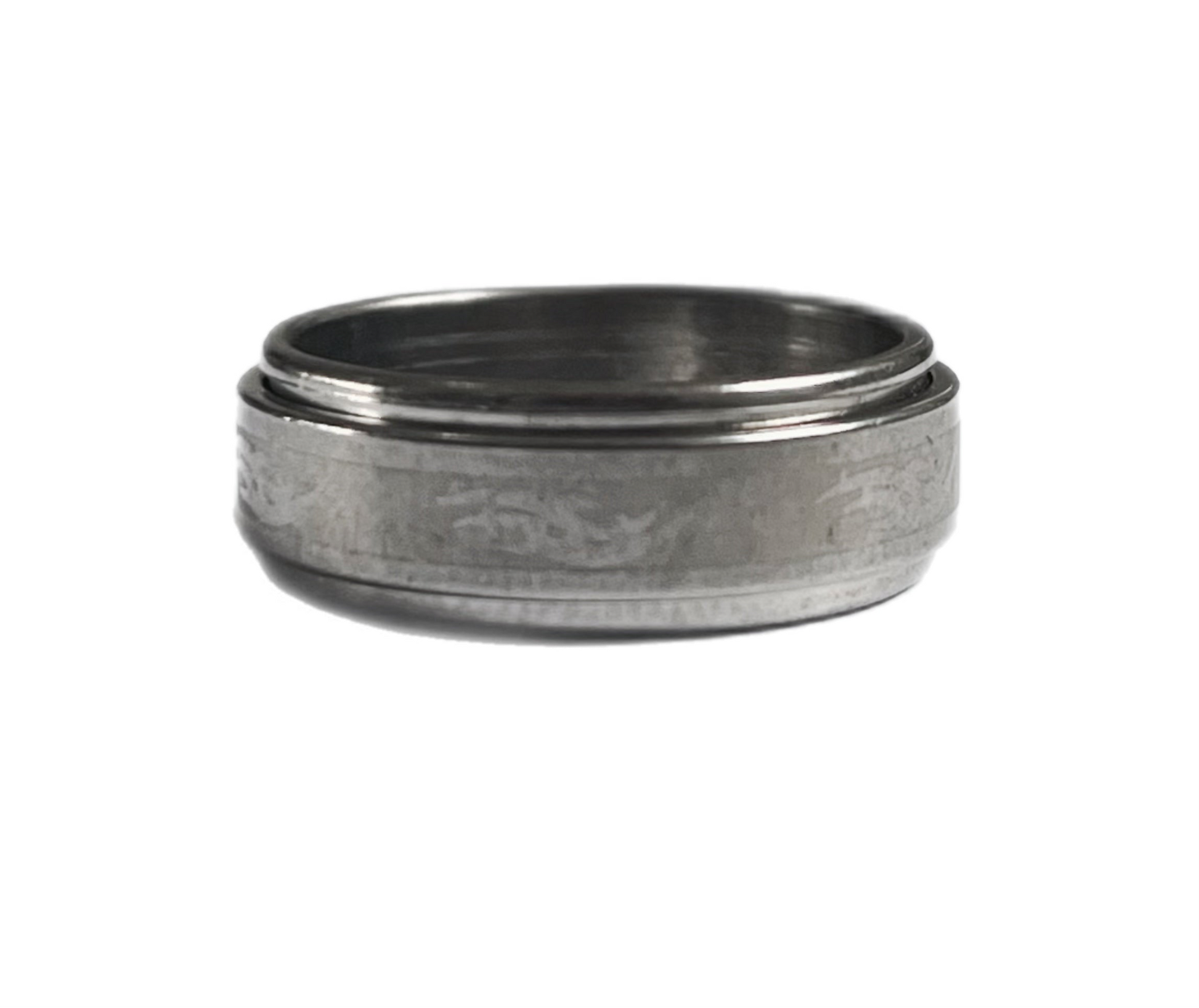 Anel Giratório Anti-Stress em Aço Inoxidável com Desenho Tribal, Cor Prata.