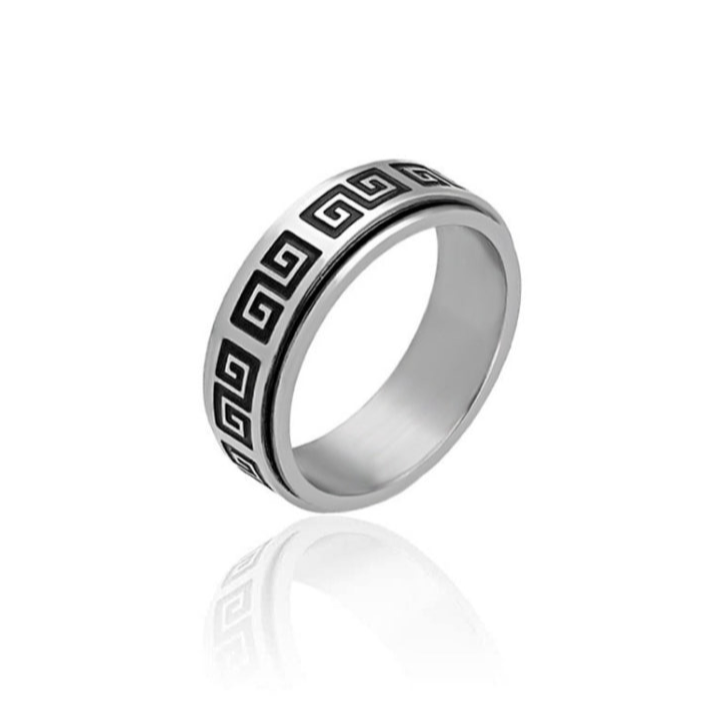 Anel em Aço Inoxidável 316L com Chave Grega desenhada, tem Corpo Duplo Anti-Stress.