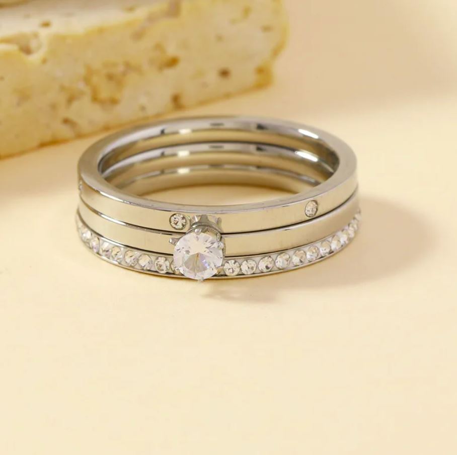 Anel de aço inoxidável de luxo para mulheres, conjunto de três peças zircão clássico.