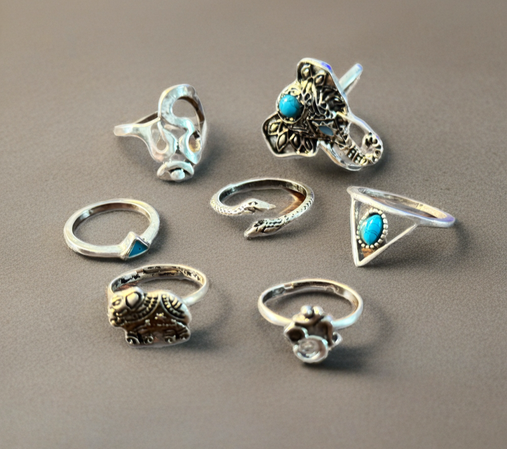 Conjunto de 7 Anéis em Prata Envelhecida, Om