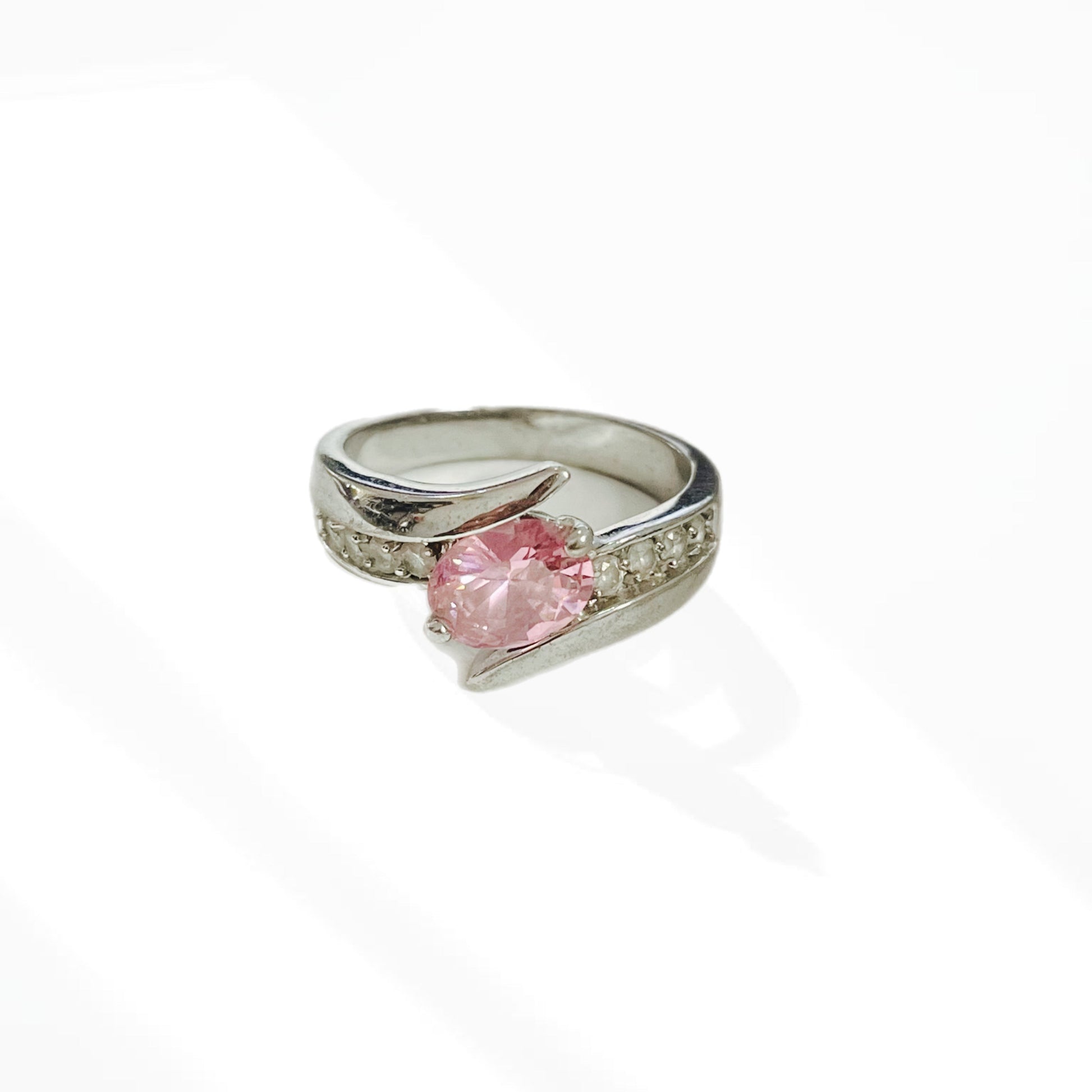 Anel Fantasia Cruzado com Zircónias Brancas e Diamante Sintético Rosa.