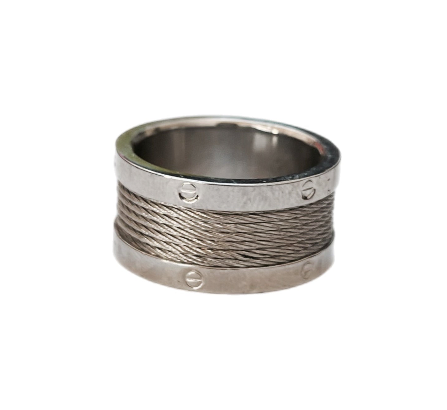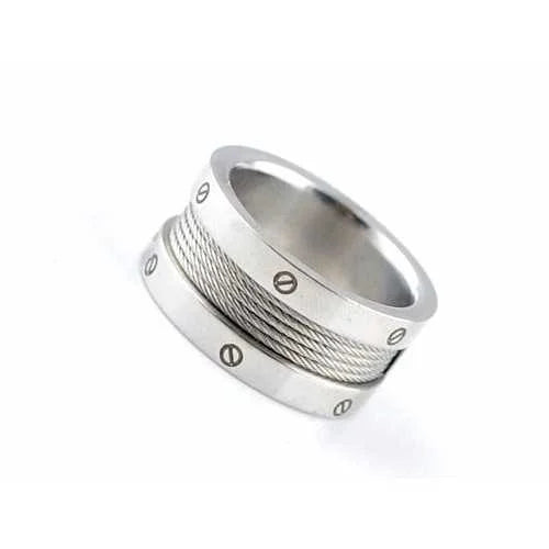 Anel de Homem em Aço Inoxidável , Estilo Cartier Love com Cabos de Aço no meio.