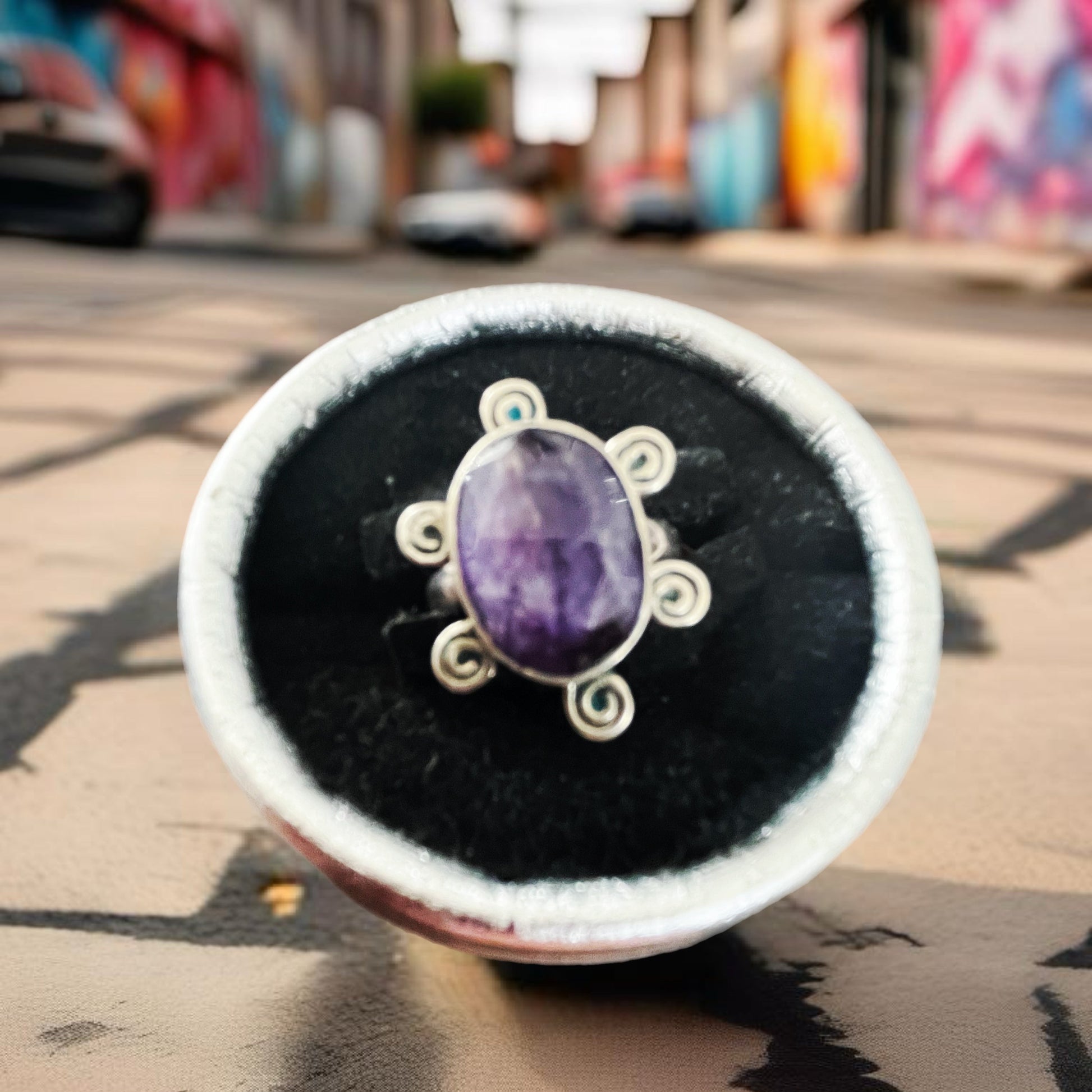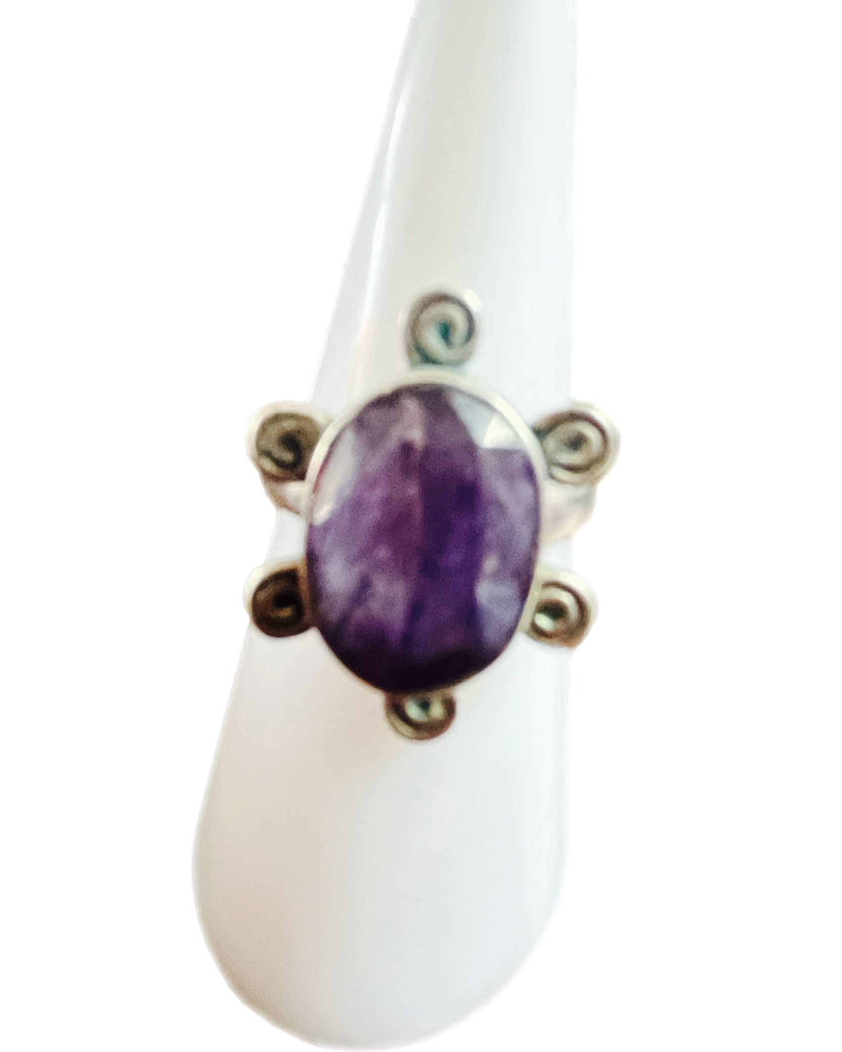 Anel de Prata com Pedra Natural Silimanita Roxa.