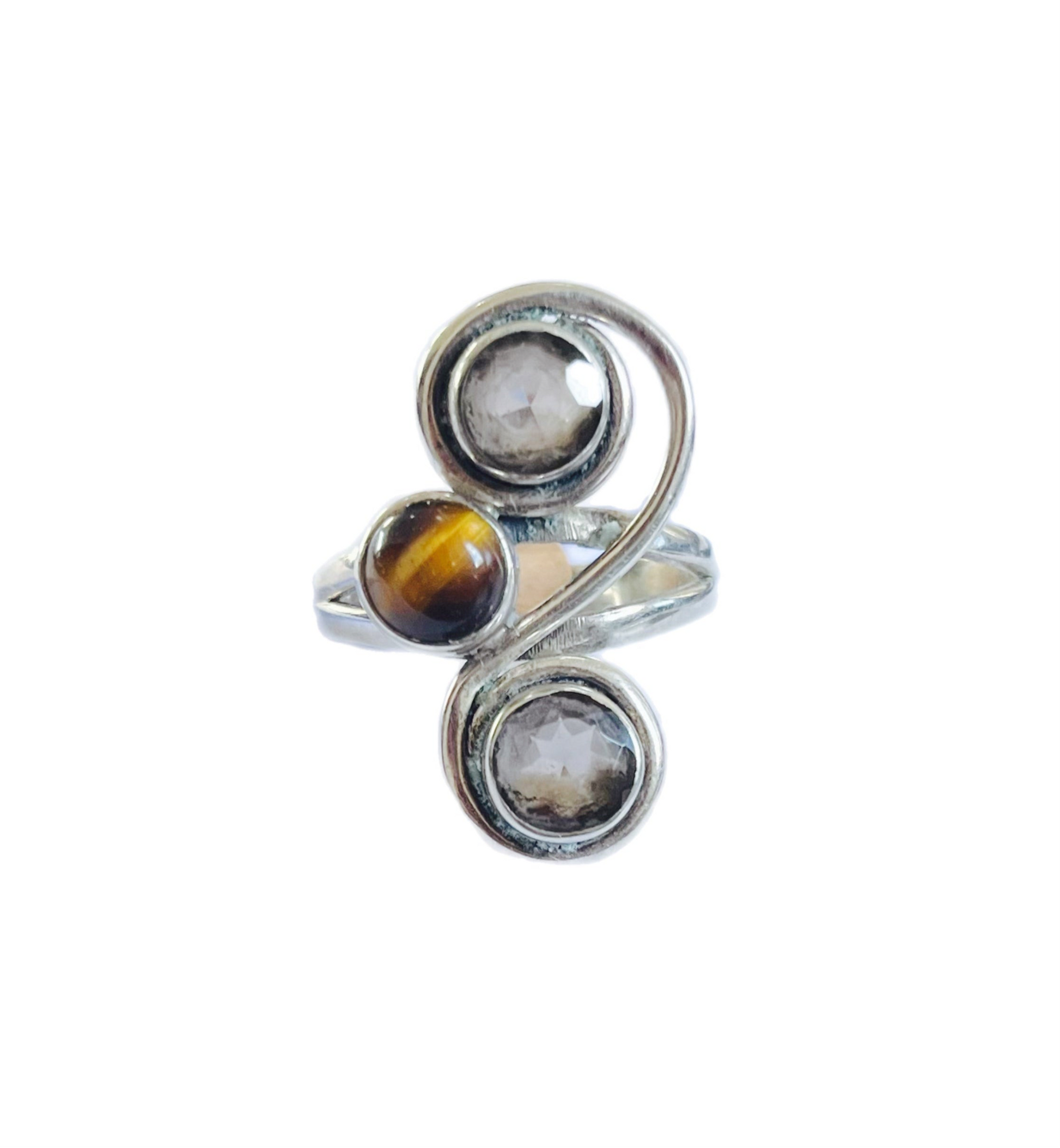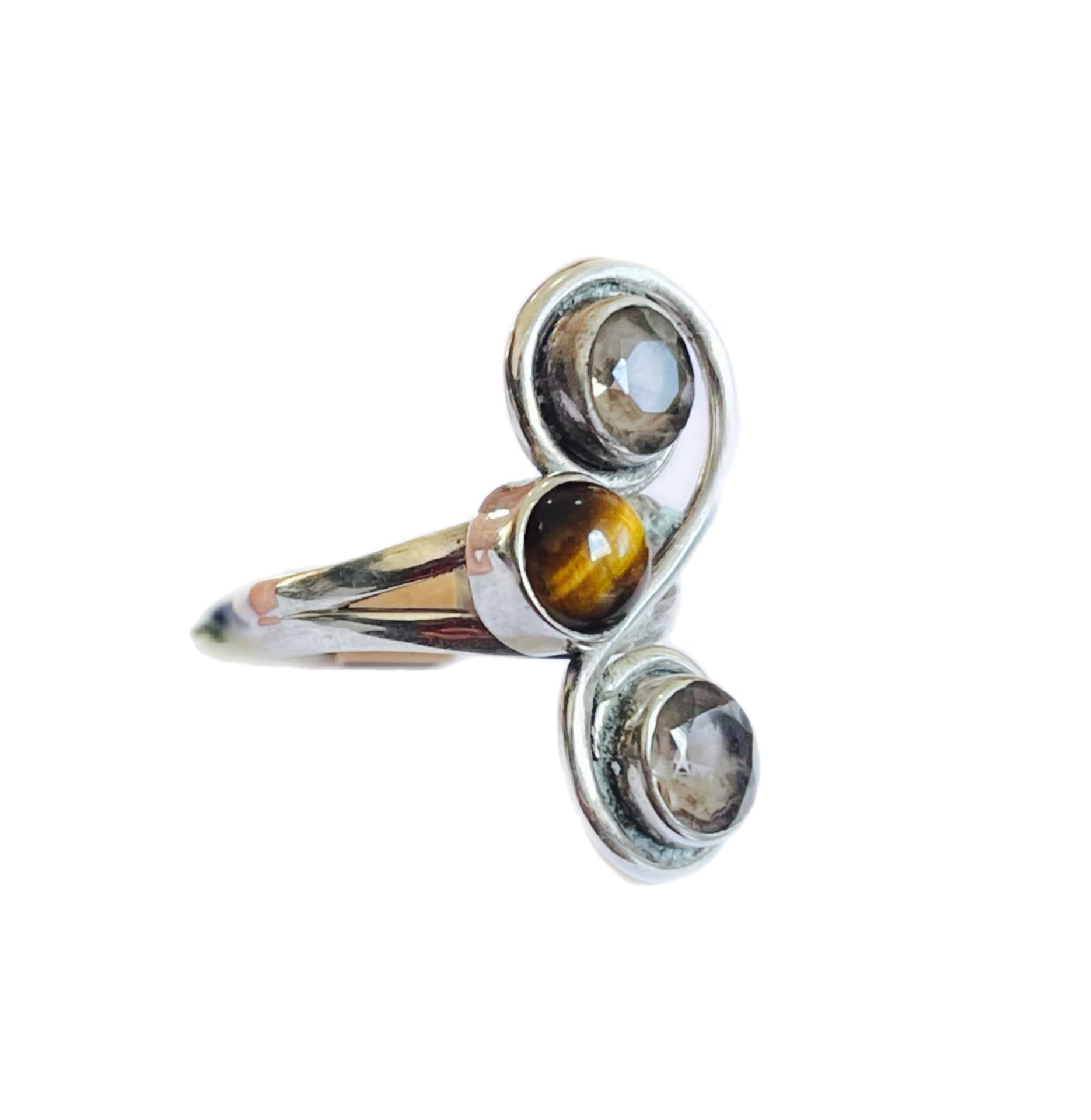 Anel de Senhora em Prata com Pedra Natural Ágata e Olho Tigre T=6
