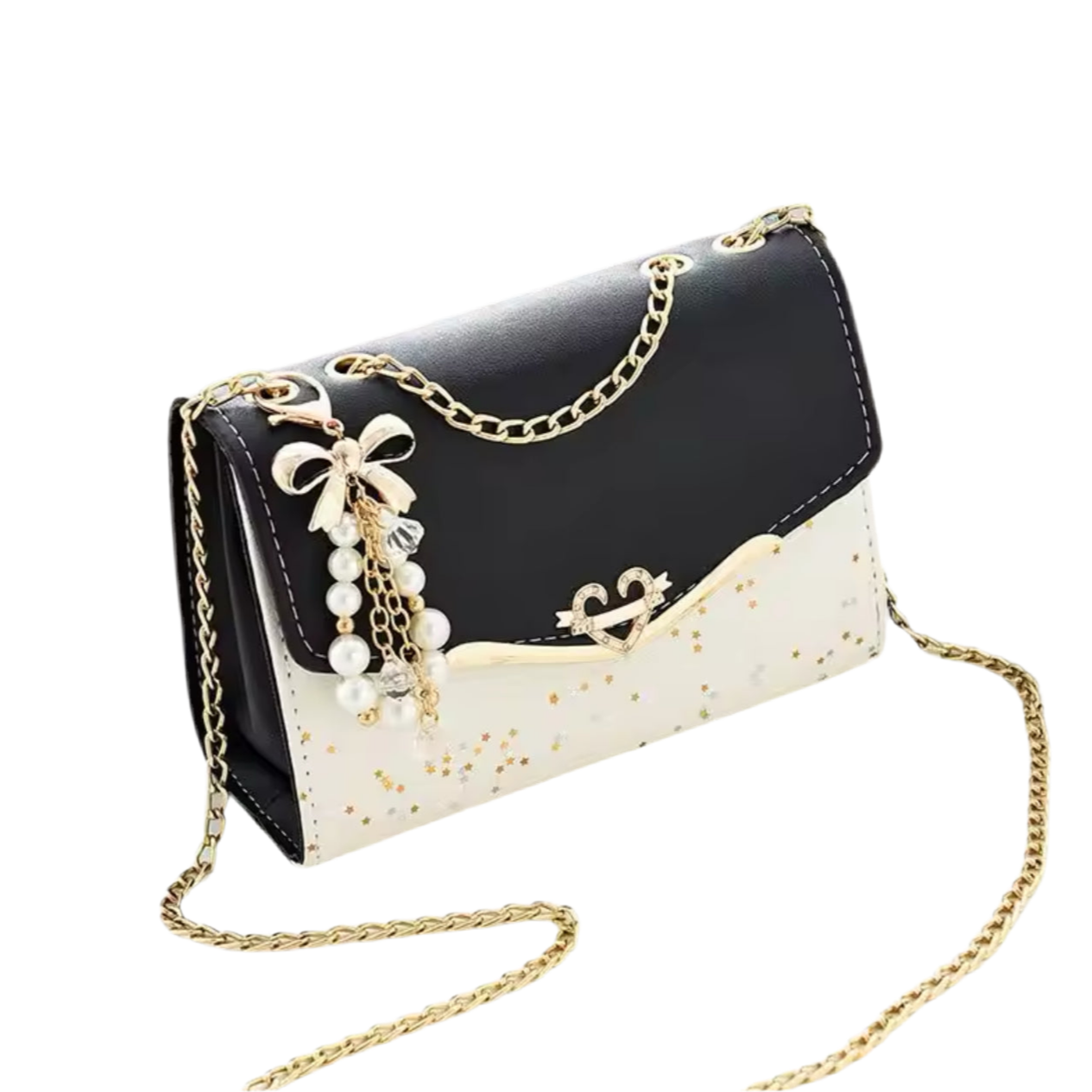Bolsa de Ombro em Couro Pu , Preta e Bege com Pingente de Laço Metálico.