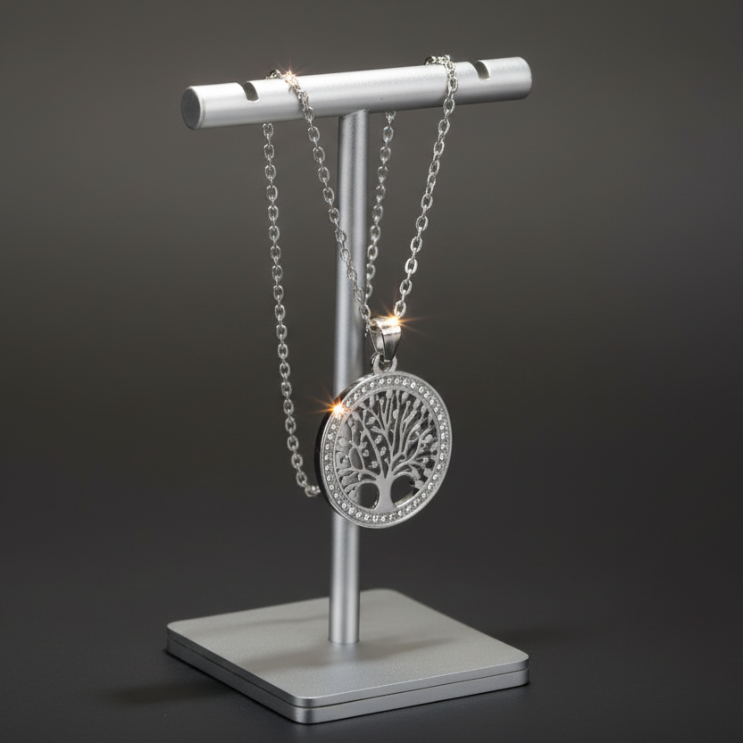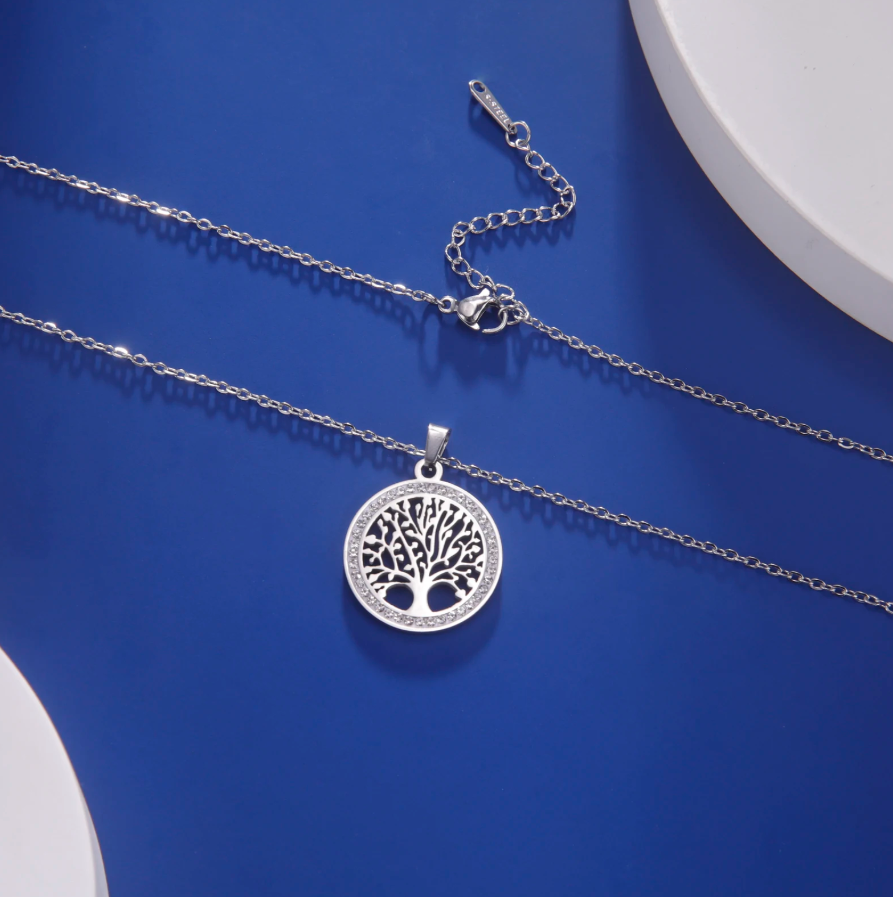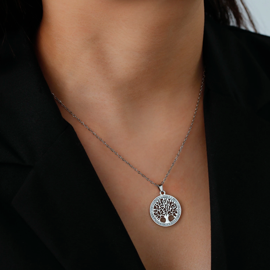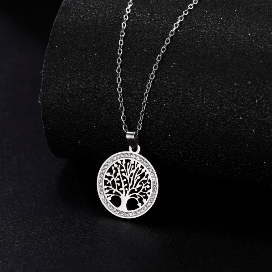 Colar em Aço Inoxidável Prata, Pingende de Árvore da Vida com Zircão Transparente.