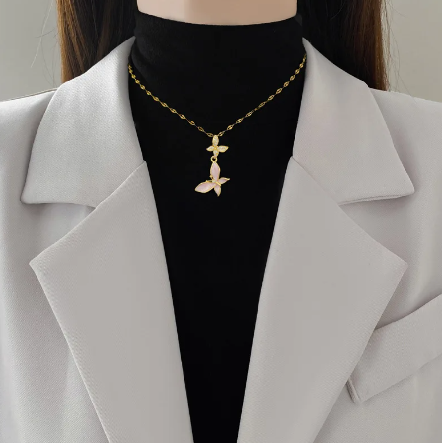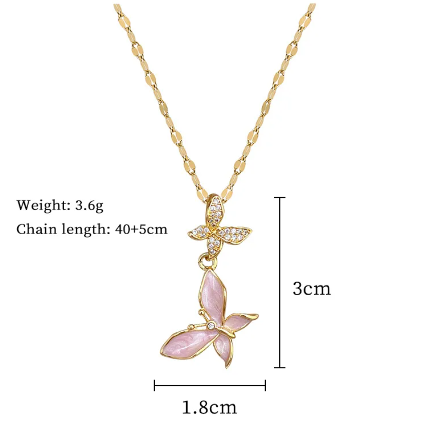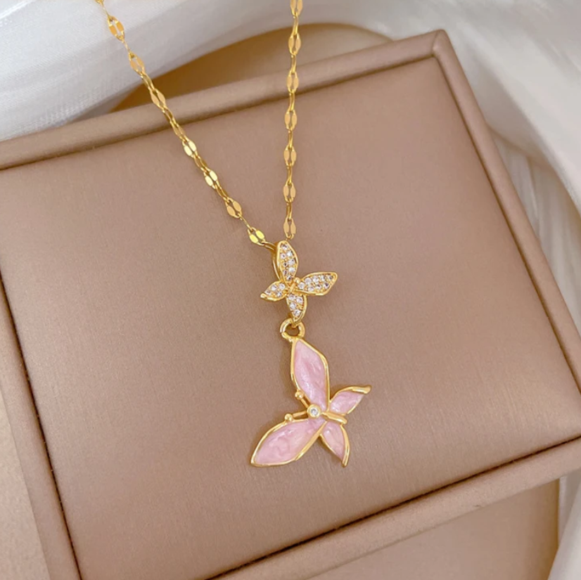Colar de Senhora em Aço Inoxidável 316L, Duas Borboletas uma pintada e óleo rosa e outra com zircões.