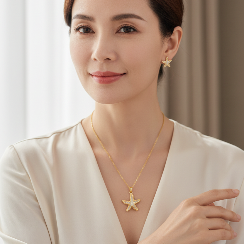 Conjunto de Colar e Brincos em Aço Inoxidável 316L de Estrela-do-Mar Dourados