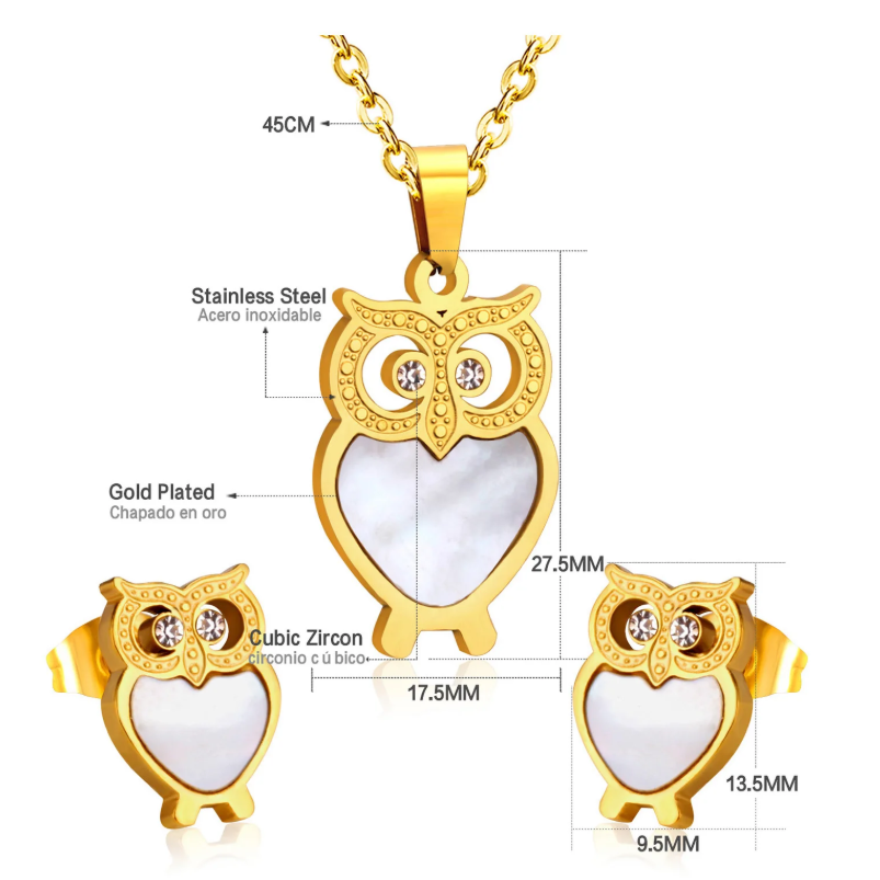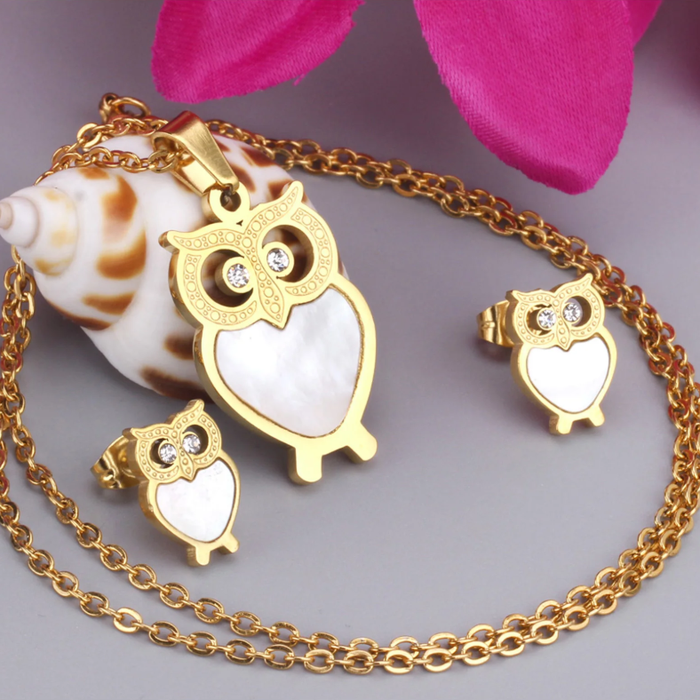 Conjunto de Colar e Brincos em Aço Inoxidável 316L de Coruja Dourada