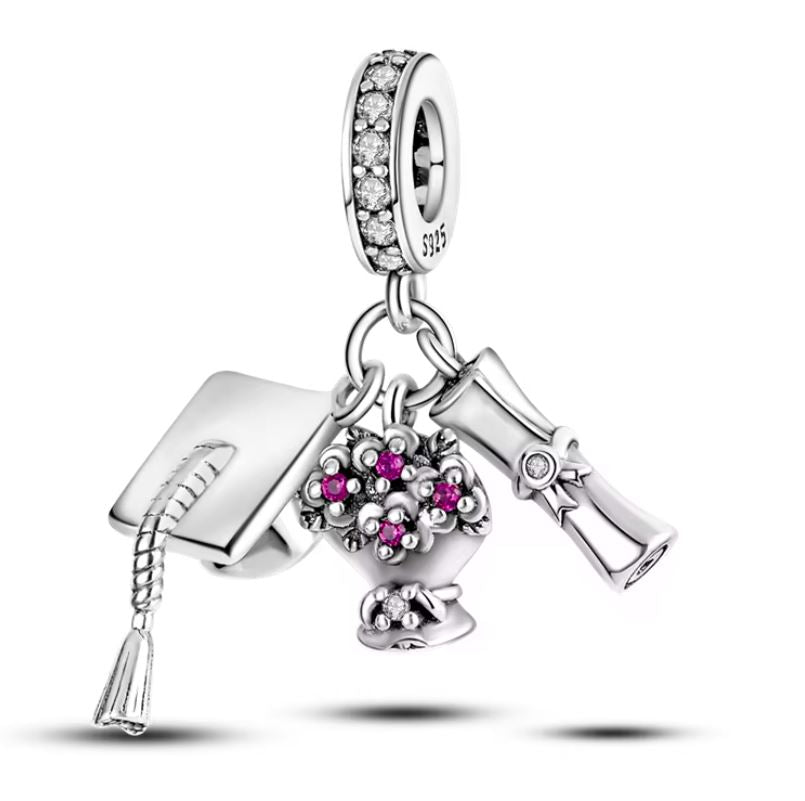 Comemore uma conquista académica com a Conta de 3 peas, em prata 925. Comemore o marco especial que serve para se recordar de todo o seu trabalho árduo, com uma conta apresentando um diploma, um chapéu de graduação e um ramo de flores, ambos numa borla pendente. Use esta conta como um símbolo do facto de que consegue tudo aquilo em que se empenha.