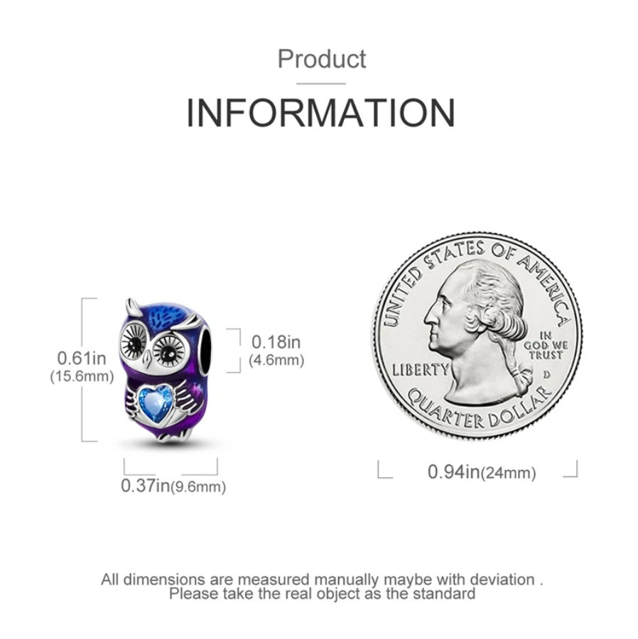 Conta em Prata 925, Coruja Azul e Roza com Zircão em forma de Coração Azul.