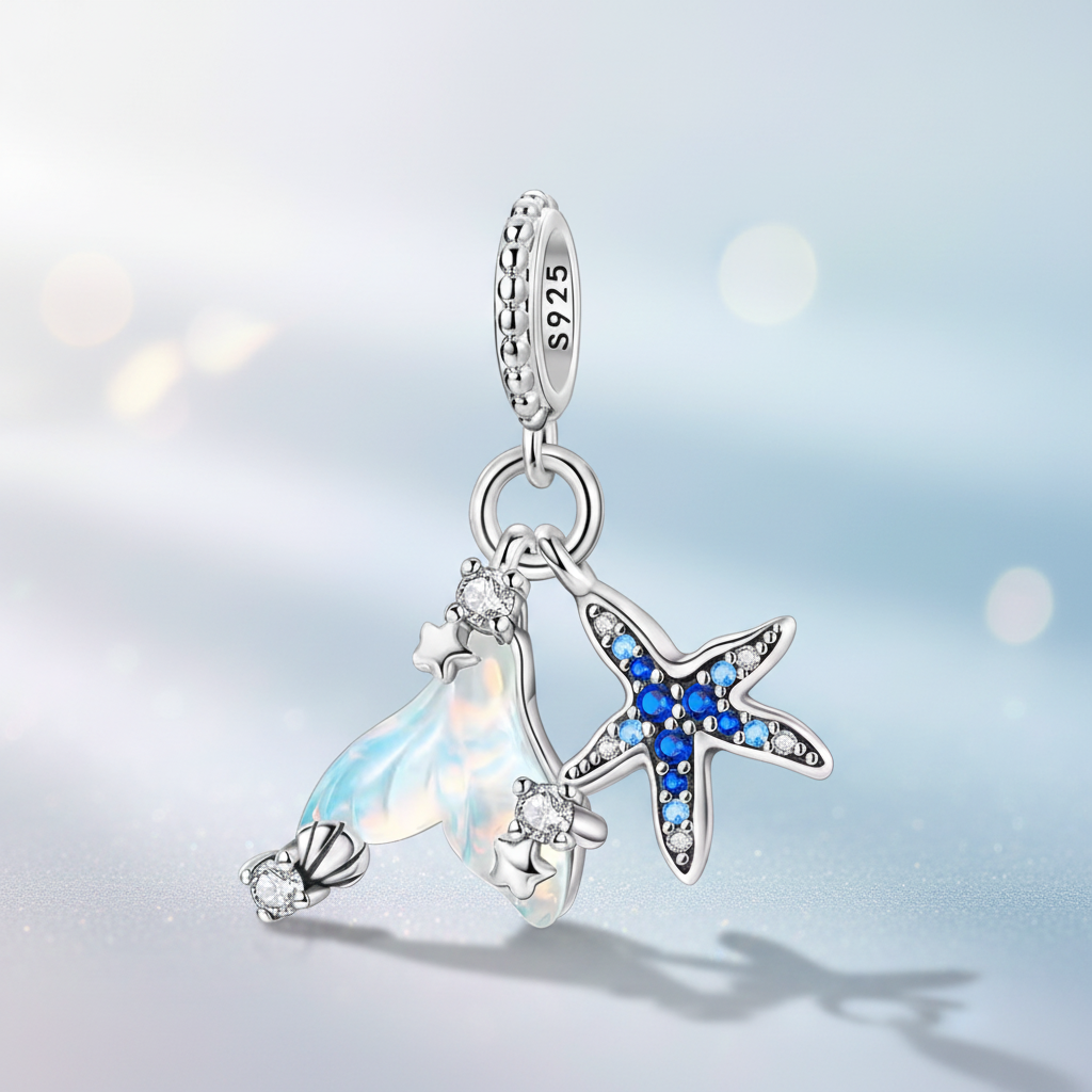 Conta em Prata 925, cauda de sereia iridescente e estrela-do-mar azul.