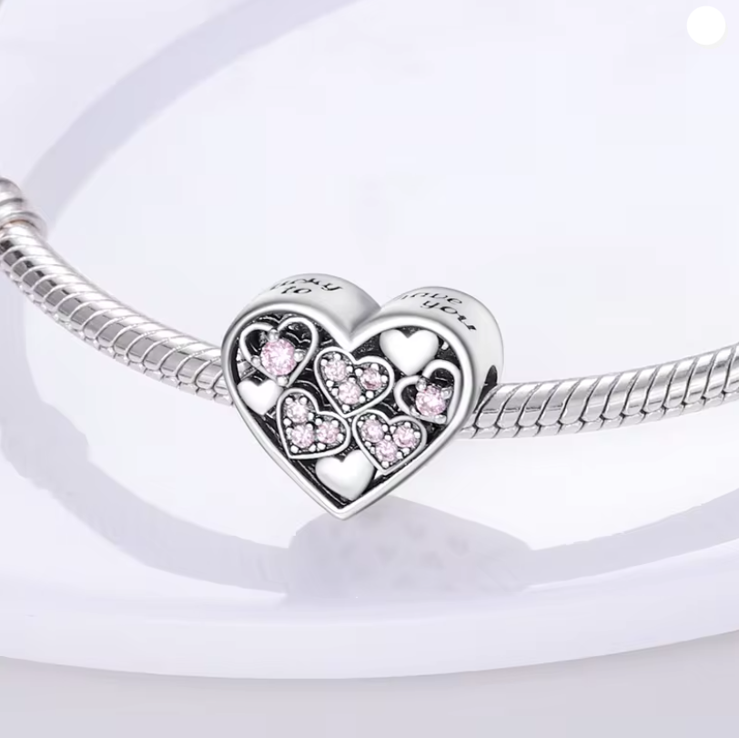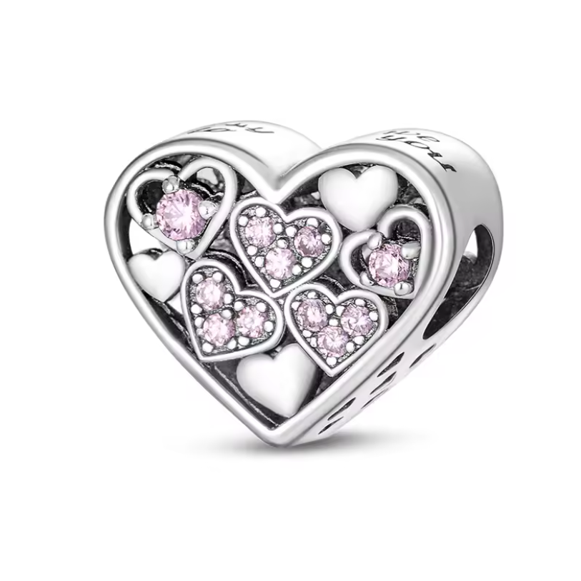 Conta em Prata 925, Coração Deslizante com Cristais Rosa e Brancos