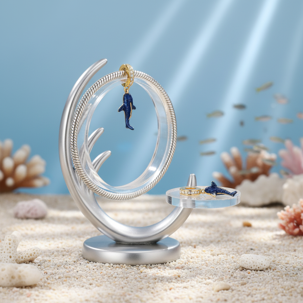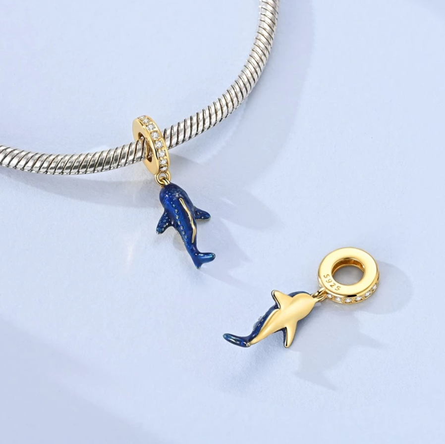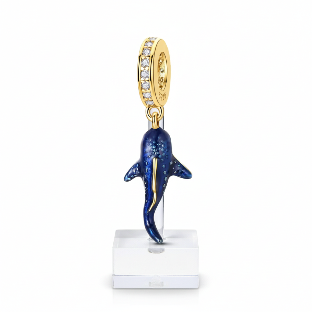 Pendente em prata esterlina 925 com representação artística de tubarão-baleia, dotado de esmalte azul profundo, acentos brancos e detalhes em tom ouro. Marcação autêntica S925 garante qualidade do material, enquanto o design dangle oferece compatibilidade com sistemas de encaixe convencionais. Funcionalidade luminescente permite visualização em ambientes com pouca luz. O tubarão-baleia, criatura oceânica que simboliza proteção e serenidade, constitui uma escolha refinada para colecionadores marinhos e mergulhadores. Berloque que une precisão técnica com significado simbólico.