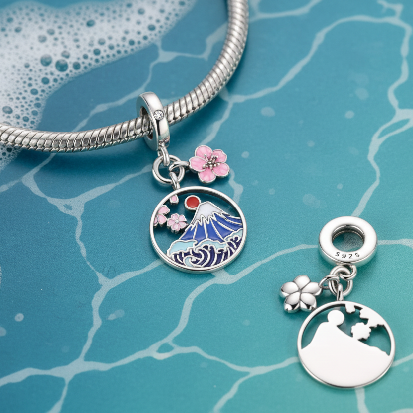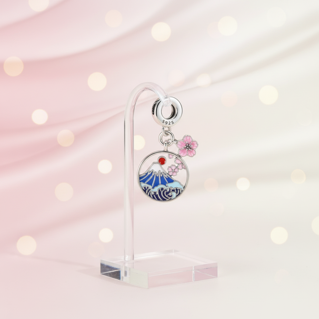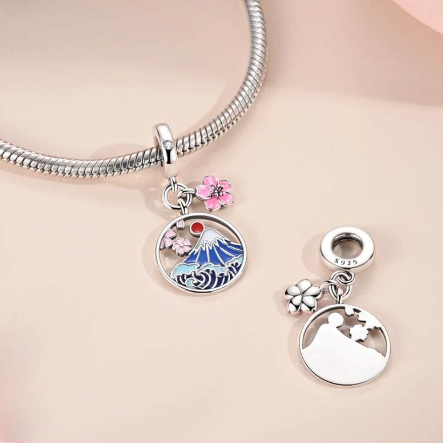 Conta Dupla em Prata 925, Monte Fuji e Flores de Cerejeira
