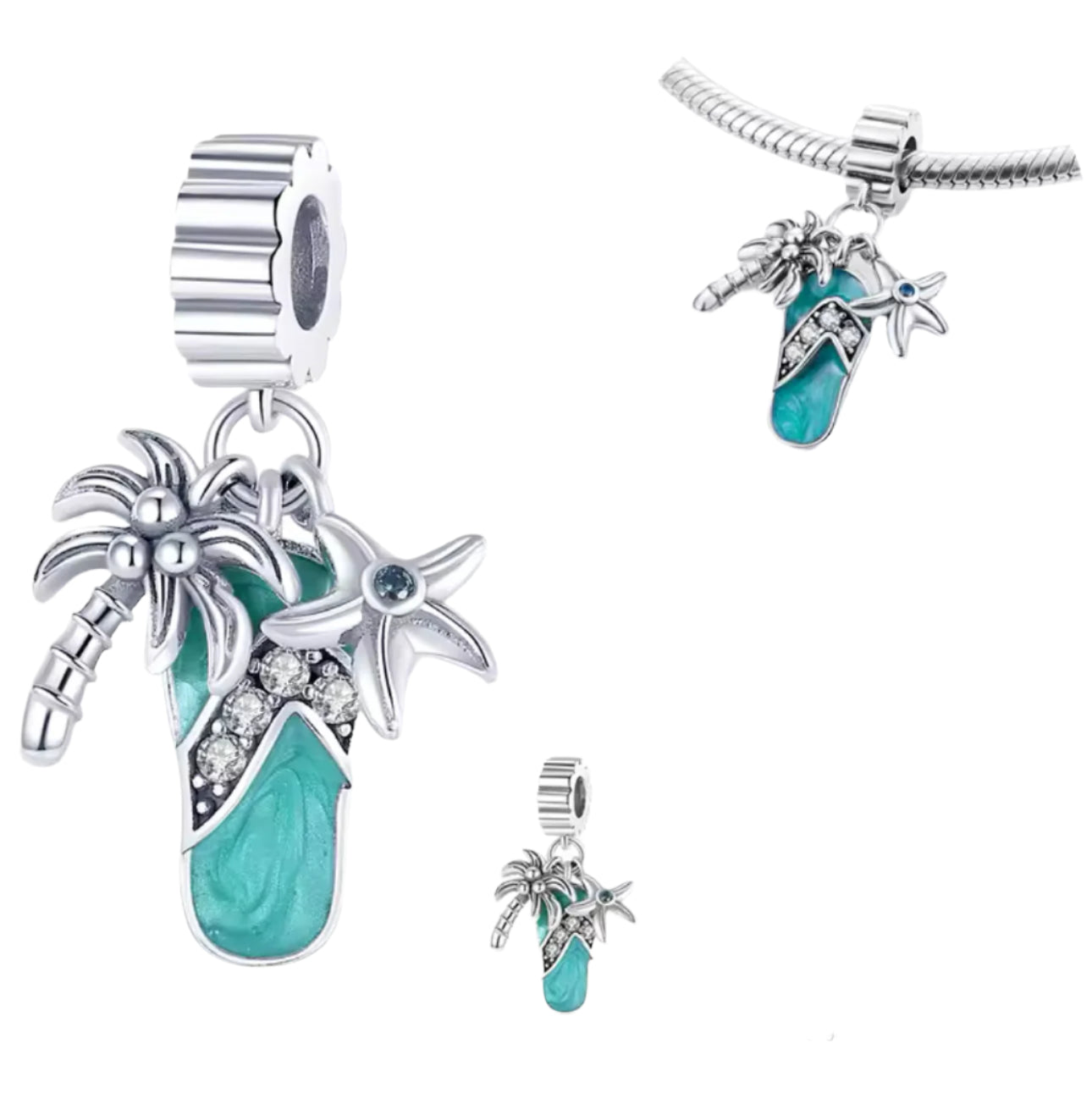 Traga consigo o Charme inspirado no verão. O icónico calçado de Verão ganha vida esmaltadas à mão. 3 em 1 com um chinelo, uma palmeira e uma estrela. Use este encanto para uma festa na praia para o transportar para um dia cheio de diversão ao sol.
