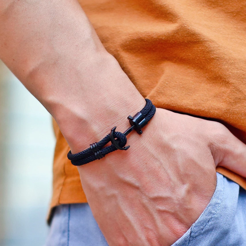 Pulseira com Corda Dupla, Pingente Âncora Preta