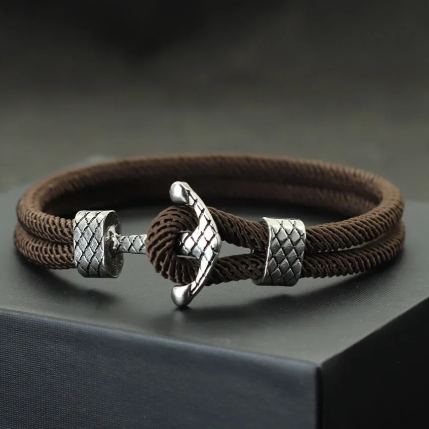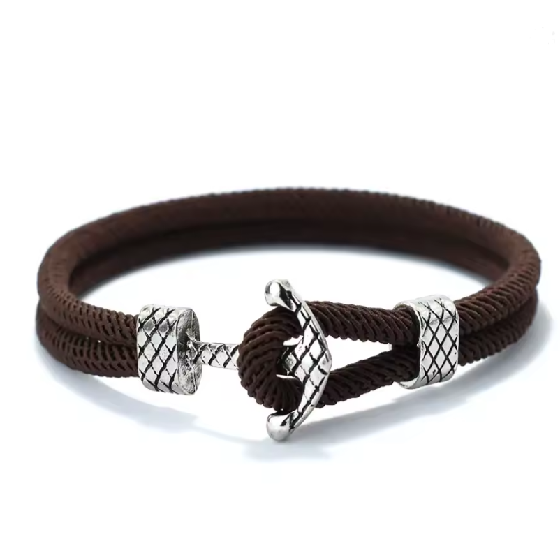 Pulseira de Corda Dupla em cabo milan Castanha, Âncora Náutica Prata.