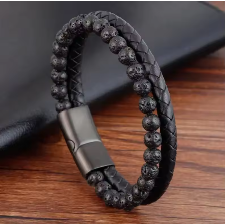 Pulseira de Homem em Couro e Pedra Vulcânica com Presilha em Inox.