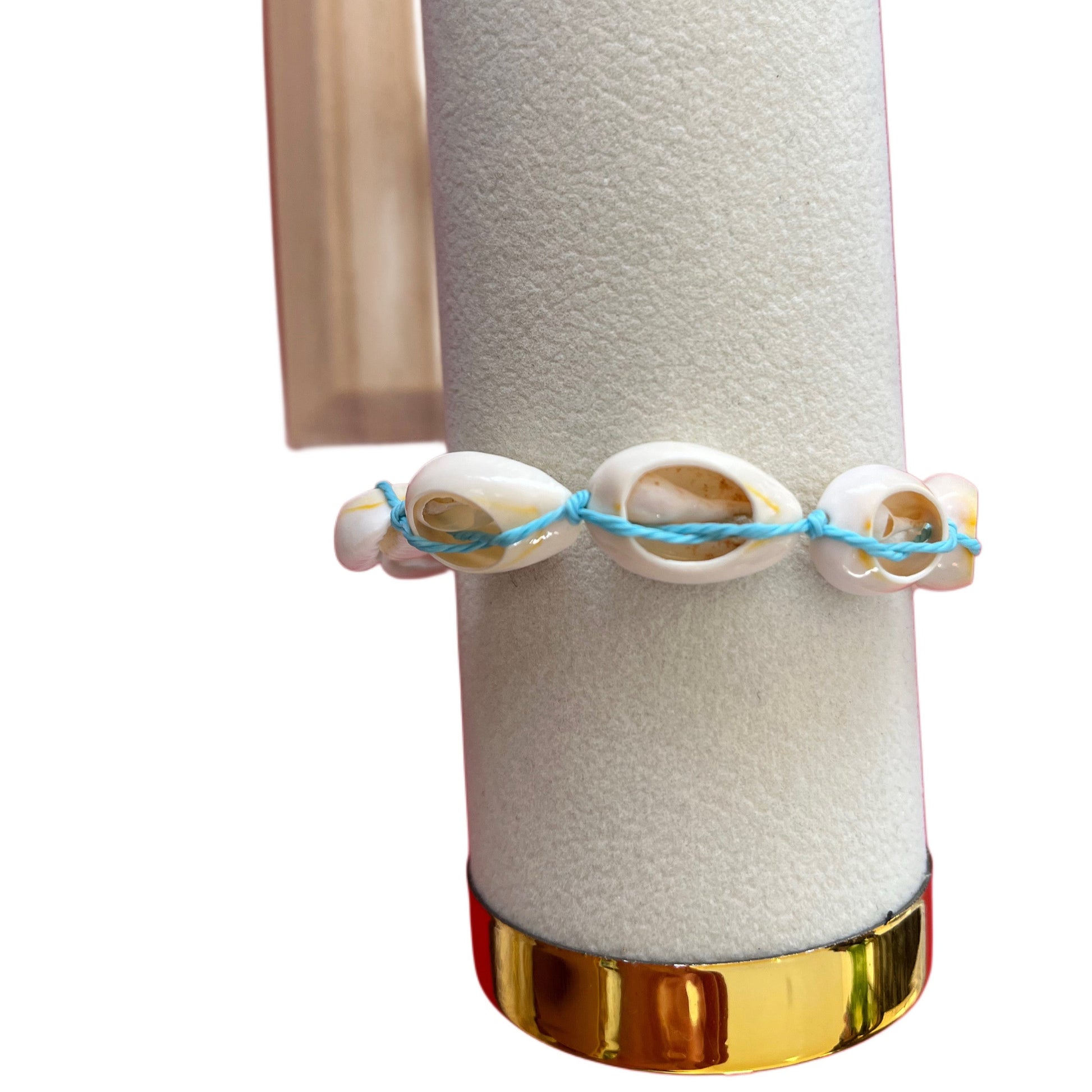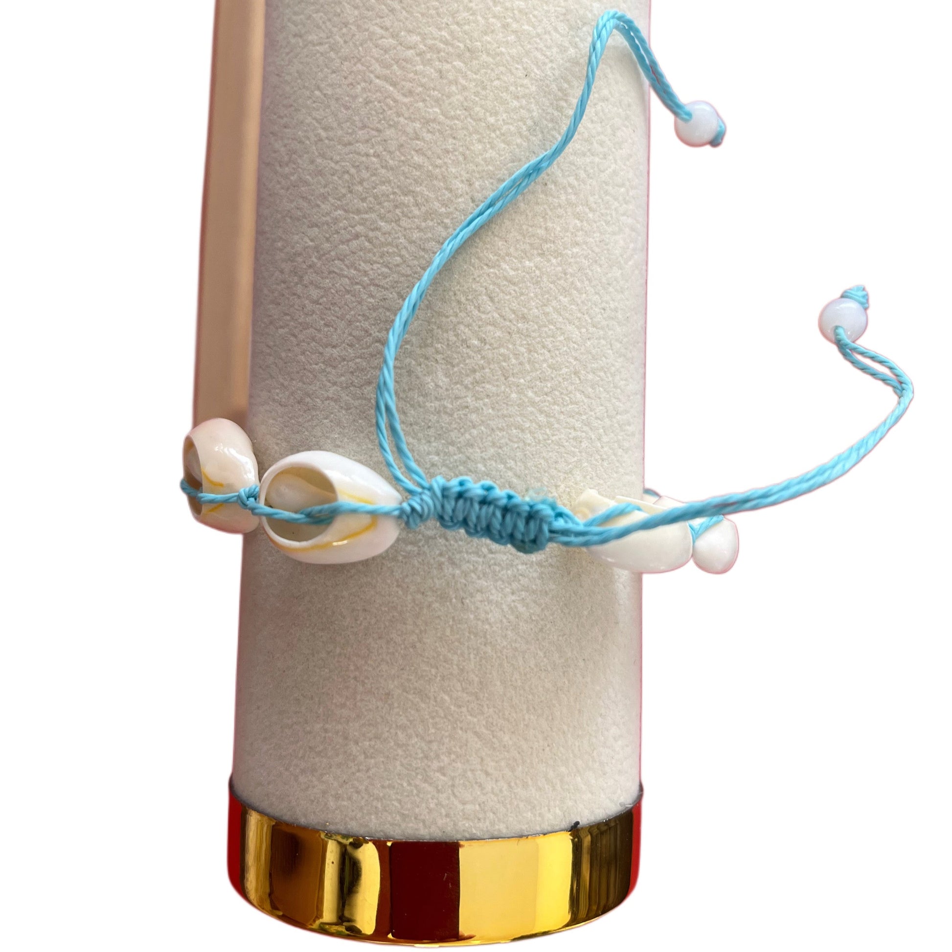 Pulseira de Senhora em Fantasia, com Búzios do Mar entrelaçado em fio azul.