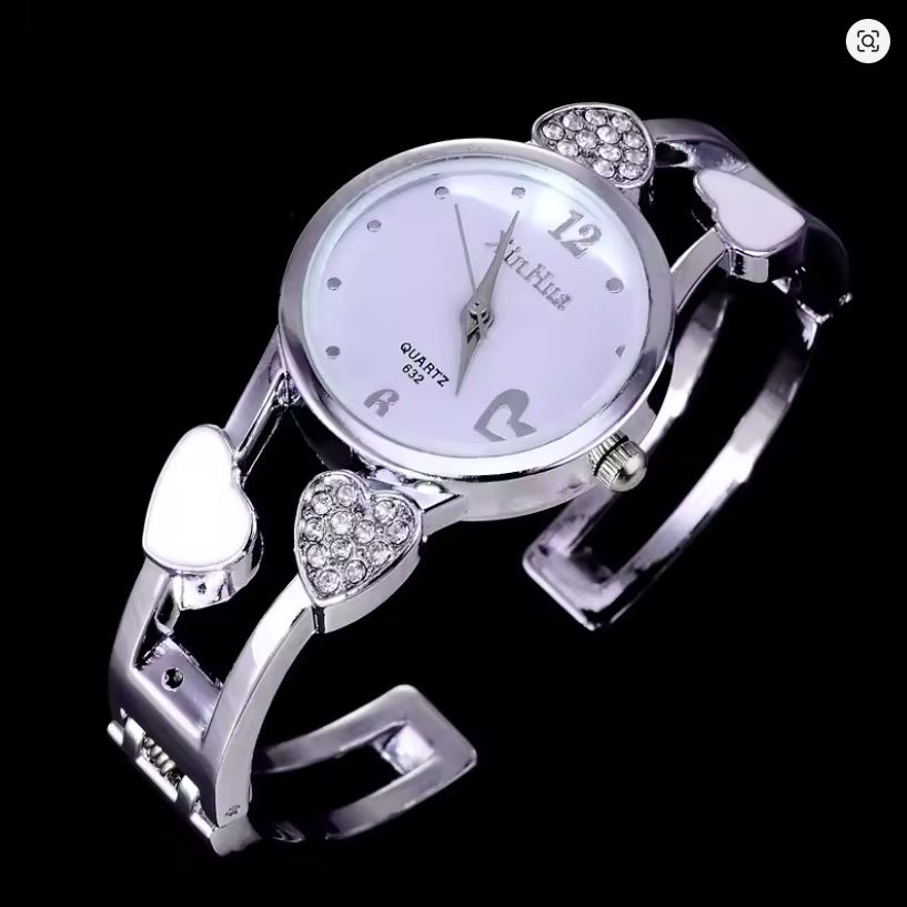 Relógio de Senhora com Pulseira Ajustável em Aço Inoxidável, Coração Prateado